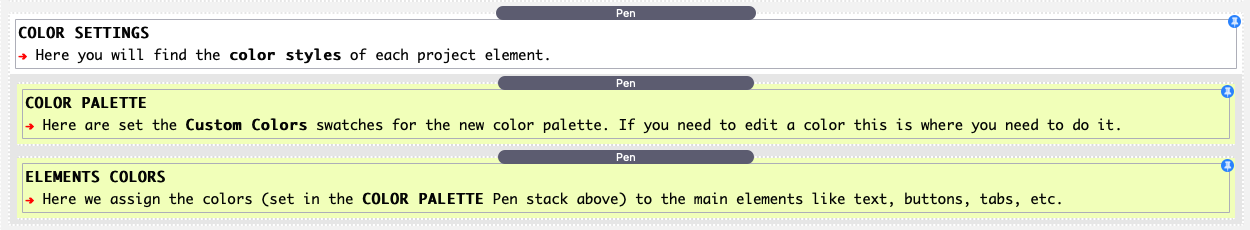 ELEMENTS COLORS Pen stack is where we assign the colors (set in the COLOR PALETTE Pen stack) to all elements (eg. text, buttons, tabs, etc.).