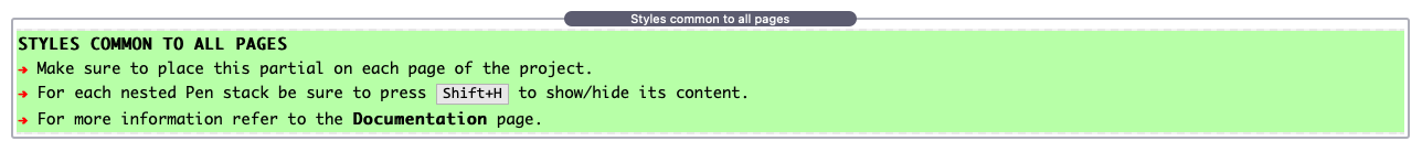 The styles, within the partial STYLES COMMON TO ALL PAGES, are organized within other Pen stacks based on type.